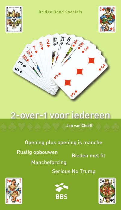 "2 Over 1 voor Iedereen" is een toegankelijk Bridge Bond Special (BBS) boek geschreven door Jan van Cleeff. Het bridgeboek biedt een eenvoudig en effectief systeem voor iedereen die de 2 Over 1-bridgeconventie wil leren begrijpen en spelen. Met talloze praktische tips en voorbeelden kunnen beginnende en gevorderde bridgers hun spel verbeteren en hun resultaten optimaliseren. Dit boek is een essentiële handleiding voor iedereen die wil beginnen met 2 Over 1 bridge en hun kennis van het systeem wil vergroten. Het 2-over-1 bieden wint aan populariteit. Het basisprincipe van de 2-over-1 aanpak, opening plus opening is manche, is logisch, makkelijk te begrijpen en goed inpasbaar in bestaande biedsystemen zoals Standaard Hoog. Het grote voordeel van 2-over-1 is dat een partnership op laag niveau belangrijke informatie uitwisselt. De aldus gecreëerde biedruimte helpt bij de beantwoording van vragen óf je naar de manche wilt gaan en zo ja, wélke. Tevens reikt het 2-over-1 systeem een afgewogen methode aan voor slemonderzoek na een gevonden fit.
