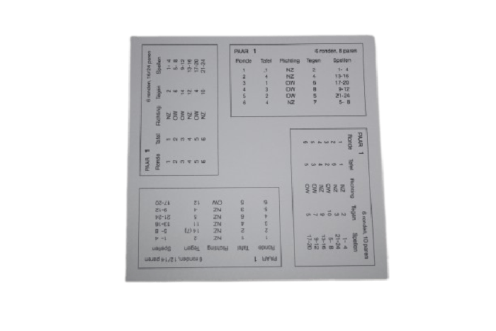 Multiplexkaarten 24&28 spellen. Set van 28 gidsbriefjes. Te gebruiken van 8 tot 28 paren. Keuze uit zes of zeven ronden van vier spellen. Verkrijgbaar in diverse kleuren. De speciale multiplexhoesjes kunt u hier bestellen