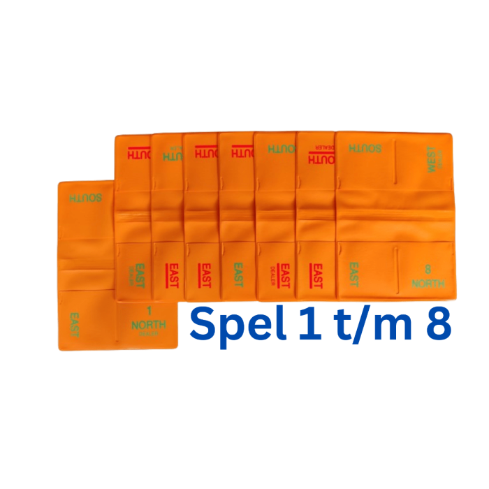 Deze oranje softboards zijn ideaal om te gebruiken tijdens een gezellig avondje thuisbridge. Elk mapje is voorzien van een spelnummer en de kwetsbaarheid. Zo zijn ze ook heel geschikt voor docenten die hun cursisten tijdens de lessen willen laten oefenen.