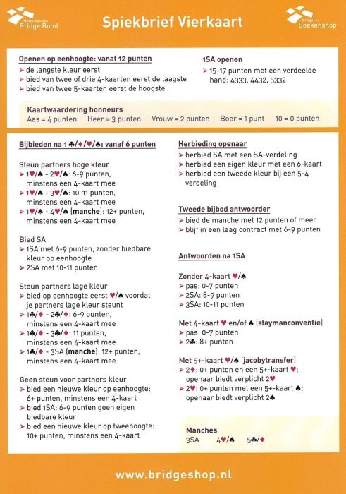 De Spiekbrief Vierkaart is een fantastische geheugensteun voor als je begint te bridgen. De Spiekbrief is gebaseerd op de leerlijnen Leer Bridge met Berry Westra, Startersbridge, Van Start tot Finish, Contract en Begin met Bridge. Er is ook een bijbehorende systeemkaart (art. nr. 1024).