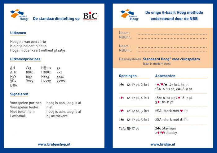 Ontdek de perfecte bridge systeemkaart voor clubspelers met de Systeemkaart "Standaard Hoog". Deze ingevulde kaart is gebaseerd op het Vijfkaart Hoog systeem en biedt een kant-en-klare oplossing voor je bridgeavonturen. Met deze systeemkaart ben je klaar om je spel naar een hoger niveau te tillen en indruk te maken tijdens clubavonden.