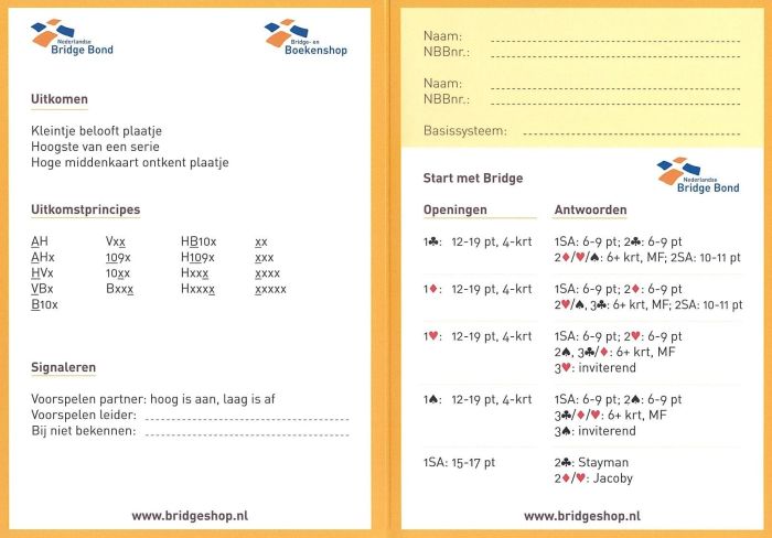 Deze systeemkaart is onmisbaar voor als je begint te bridgen. De systeemkaart is gebaseerd op de leerlijnen Leer Bridge met Berry Westra, Startersbridge, Van Start tot Finish, Contract en Begin met Bridge. Er is ook een bijbehorende Spiekbrief (art. nr. 4824).