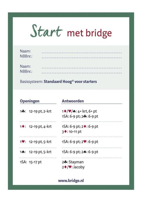 Systeemkaart Start met bridge, behorende bij de methode van de NBB, de Nederlandse Bridge Bond.