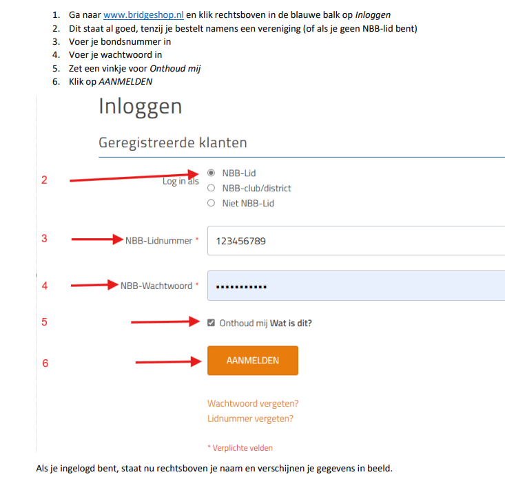 Je kunt inloggen met je NBB-Lidnummmer en NBB-Wachtwoord. Dit wachtwoord is hetzelfde als je wilt inloggen op je account via MijnBridge. Heb je je nog niet aangemeld bij MijnBridge dan is het noodzakelijk dat eerst te doen (MijnBridge). Hier ontvang je eerst een eenmalig wachtwoord. Het wachtwoord dat je ontvangt is hoofdlettergevoelig. Neem het exact over, anders wordt het niet geaccepteerd. Nadat je voor de eerste keer bent ingelogd moet je direct het wachtwoord vervangen door een persoonlijk wachtwoord. Met dit persoonlijk wachtwoord kun je inloggen in de webwinkel van de Bridge- en Boekenshop. Als er geen e-mailadres van jou bekend is bij de BridgeBond kun je je wachtwoord pas opvragen nadat je je e-mailadres hebt doorgegeven aan helpdesk@bridge.nl.